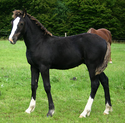 Unsere Sydenham Solomon Enkelin hat uns ihr erstes Fohlen zur Welt gebracht. Ein sehr schönes Rapphengstfohlen mit bizarrer Blesse und weißen Stiefeln hinten. Der Vater ist Bronfoel Harri . Auf dem Bild erst einige Tage.