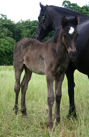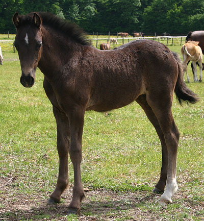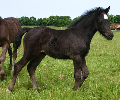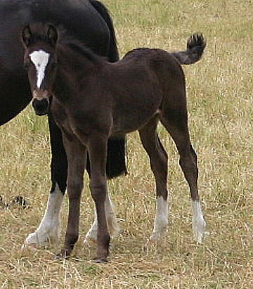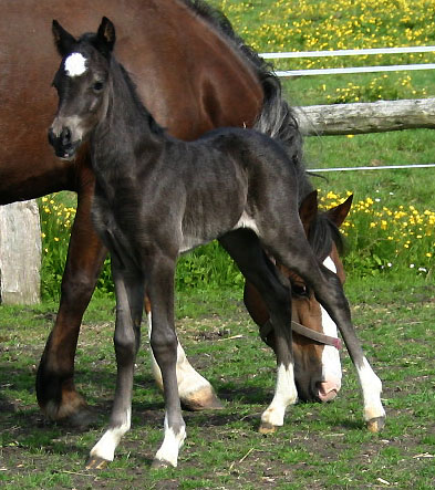 Unsere Nebo Daniel Tochter hat dieses Jahr ein sehr kompaktes Rapphengstfohlen mit bizarrer Blesse und weißen Socken. Der Vater ist Bronfoel Harri und es ist auf dem Bild erst einige Tage alt. Sehr keck, ein kleiner Wirbelwind mit tollem Pedigree, aber das Fohlen ist klein und wird als C eingetragen, daher