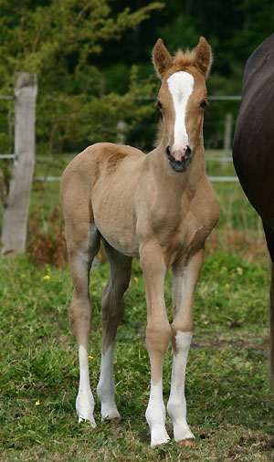 Unsere Derwen Royal Express Enkelin hat uns sehr überrascht und uns ein sagenhaftes großrahmiges und extrem knochenstarkes Palomino Stutfohlen mit Blesse und 4 weißen Stiefeln gebracht. Der Vater ist C. Apollo und es ist nicht zu übersehen.