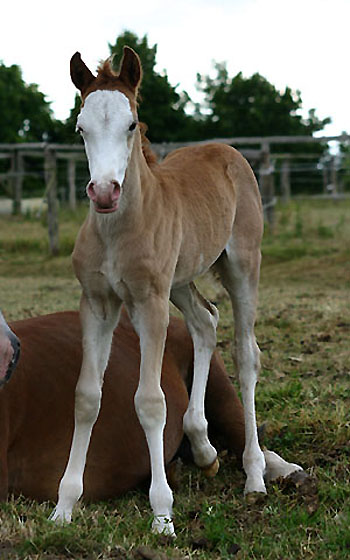 Unsere Trefaes Cream Boy Tochter hat heute nacht ein wunderschönes sehr typvolles Fuchs Stutfohlen zur Welt gebracht mit einer kleinen kessen Blesse und weißen Socken . Dieses Fohlen hat einen tollen Typ und super Gang. Der Vater ist Synod Roxbury, Ricadonna hat sich nun zu einem Palomino entwickelt und eine wunderschöne goldene Farbe.
