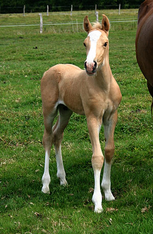 Unsere Synod Replay Enkelin hat uns sehr überrascht und uns ein wunderschönes knochenstarkes Stutfohlen zu Welt gebracht. Es ist eine kleine Palomino Lady mit weißen Socken und Blesse. Sie hat sehr viel Präsenz und der Vater ist Nebo Danny.