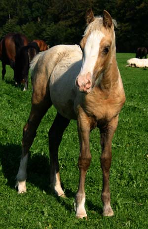 Unsere Nebo Prince Enkelin hat uns sehr überrascht und uns ein sagenhaftes großrahmiges und extrem knochenstarkes Falb Stutfohlen gebracht. Eine zukünftige Zuchtstute für Arvalon , Blesse und 4x hoch weiß gestiefelt. Herrlich bunt und steht gleich da wie sein Vater C. Apollo. Wir sind begeistert!!!!!!!!!!