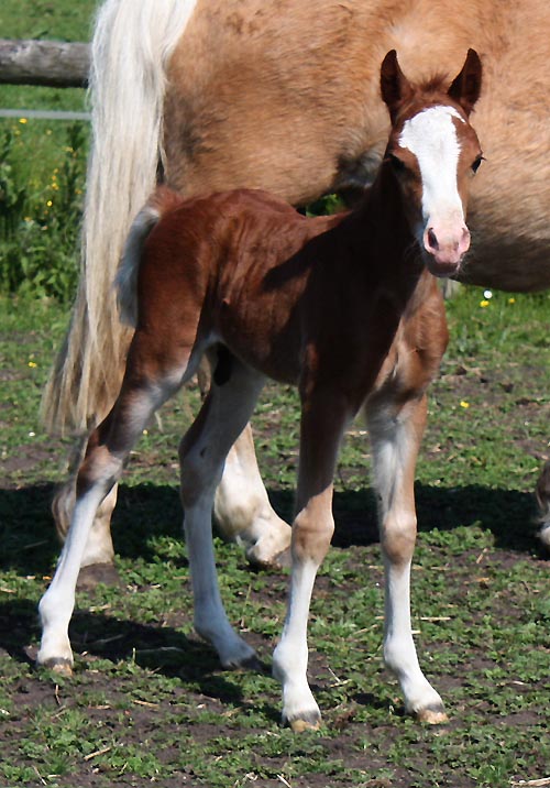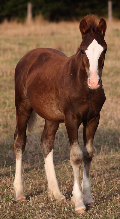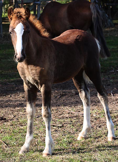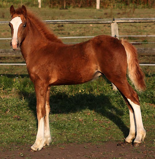 Dieser kleine Kerl ist das Ergebnis einer verliebten sehr alten Prudence, die nach Jahren ohne Fohlen durch den Zaun gelaufen ist zu unserem Goldprinz Scooby Do. Sie ist 3 Tage mit ihm auf der Weide gelaufen, wir konnten Sie nicht fangen. Das Ergebnis ist dieser schicke Kerl mit 4 hohen weißen Stiefeln . Ein tolles Fohlen - es erinnert mich an Arvalon Braint. |