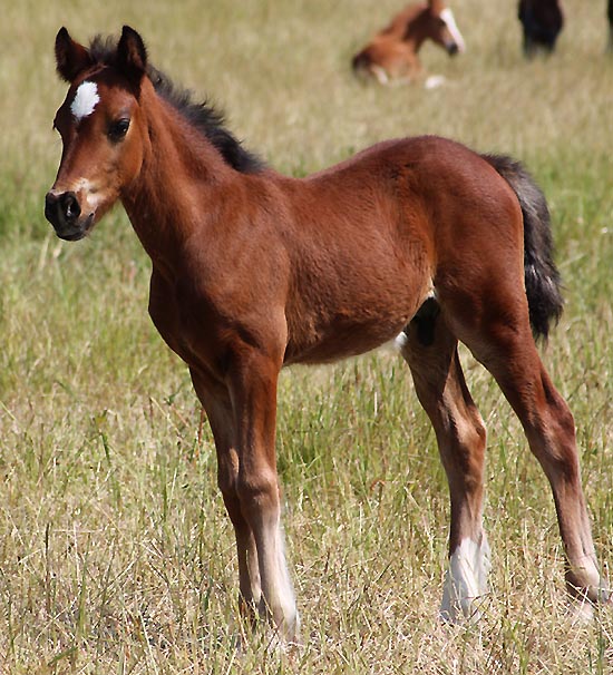 Dieses Stutfohlen ist wieder ein kleines Abbild unseres Apollo mit 4 hohen weißen Stiefeln und Bauchfleck. Vollschwester von Golden Ivy - ein absolutes Traumfohlen . Wird ebenfalls Zuchtstute auf Arvalon. |