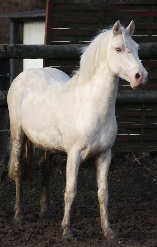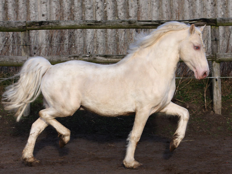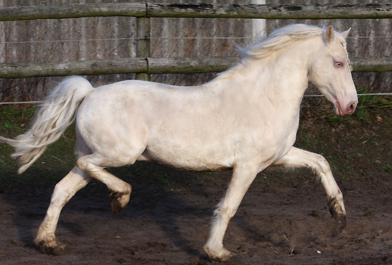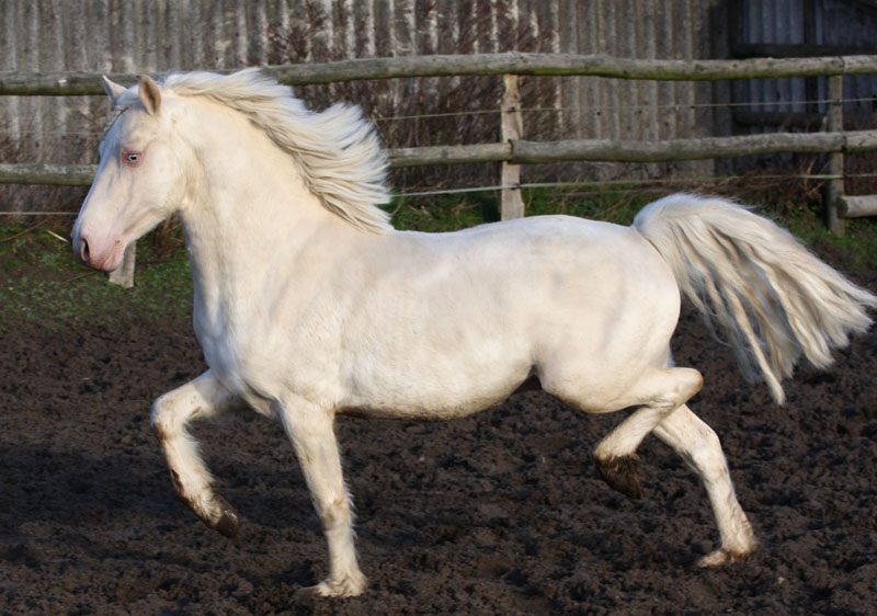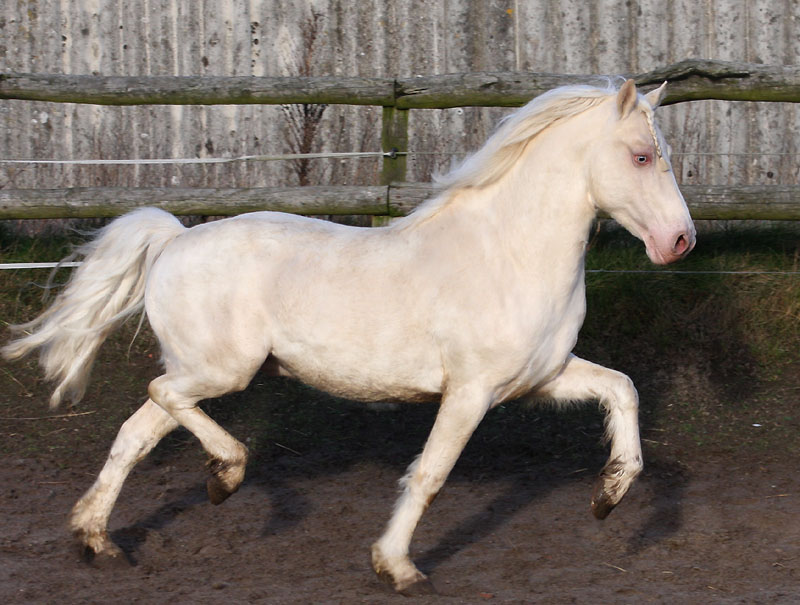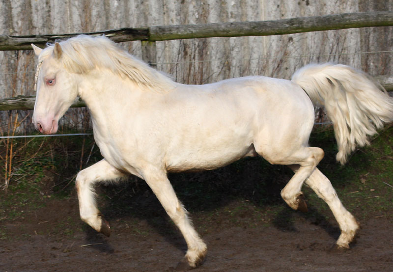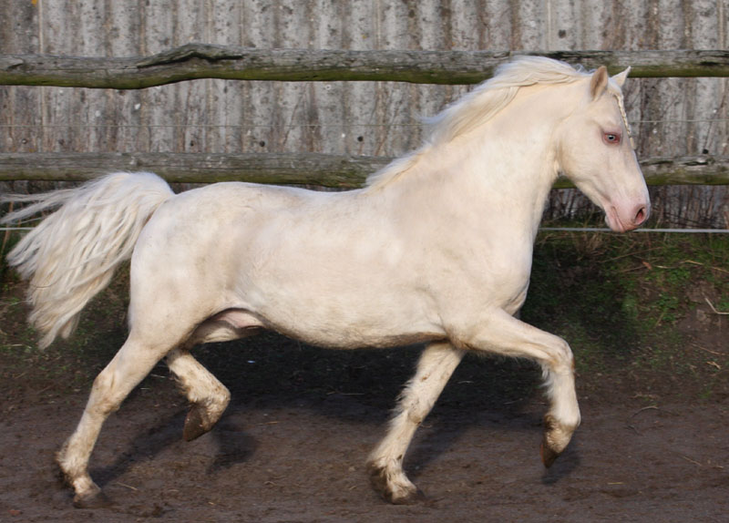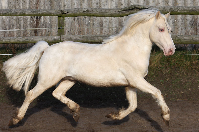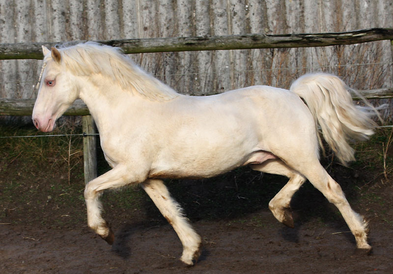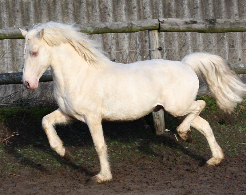 Indigo ist einer der wenigen Cremello Welsh Cob Hengste in der Zucht. Seine Fohlen haben unsere Erwartungen mehr als übertroffen, er vererbt tolle Farbe, Gang und typvolle Fohlen mit viel Rahmen. Es sind Wunschfarben bei den Fohlen möglich, je nach Grundfarbe der Stute.
