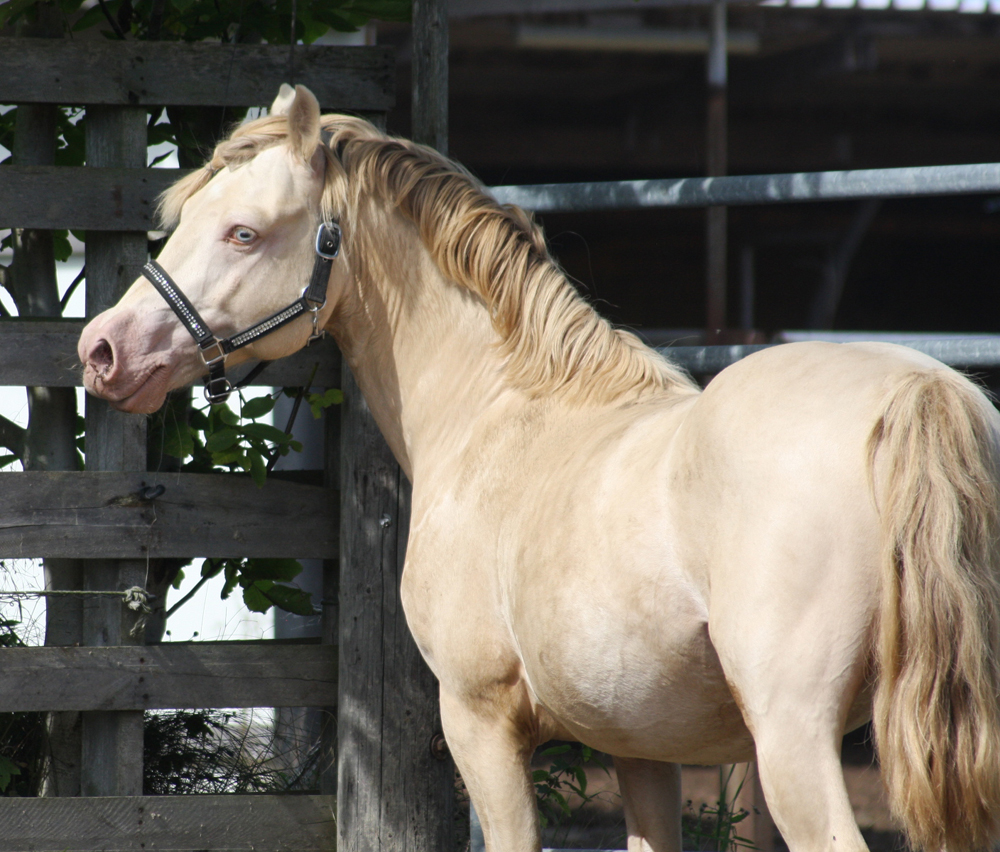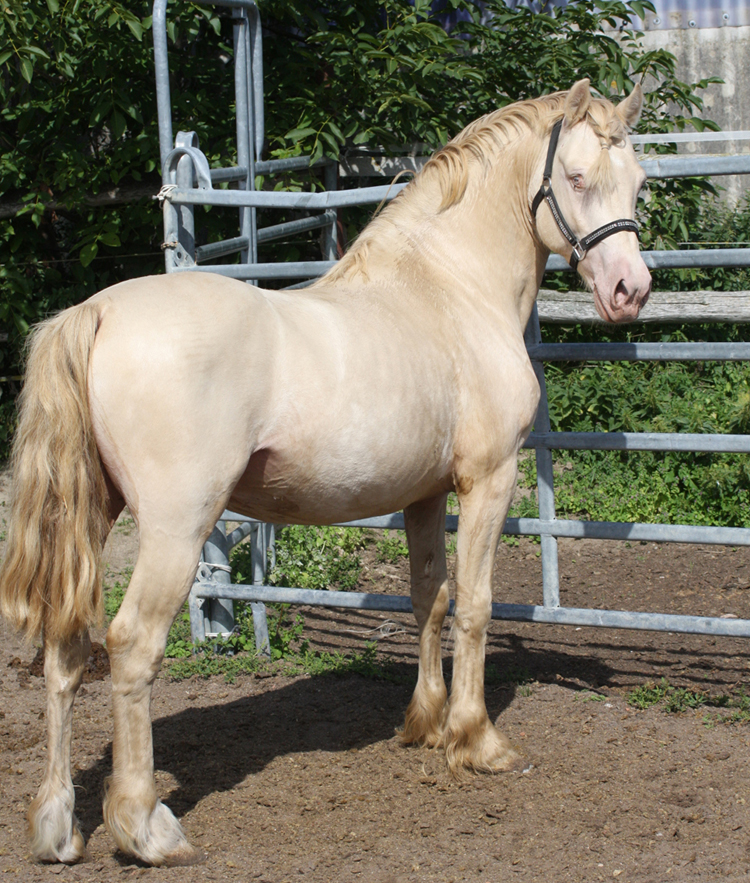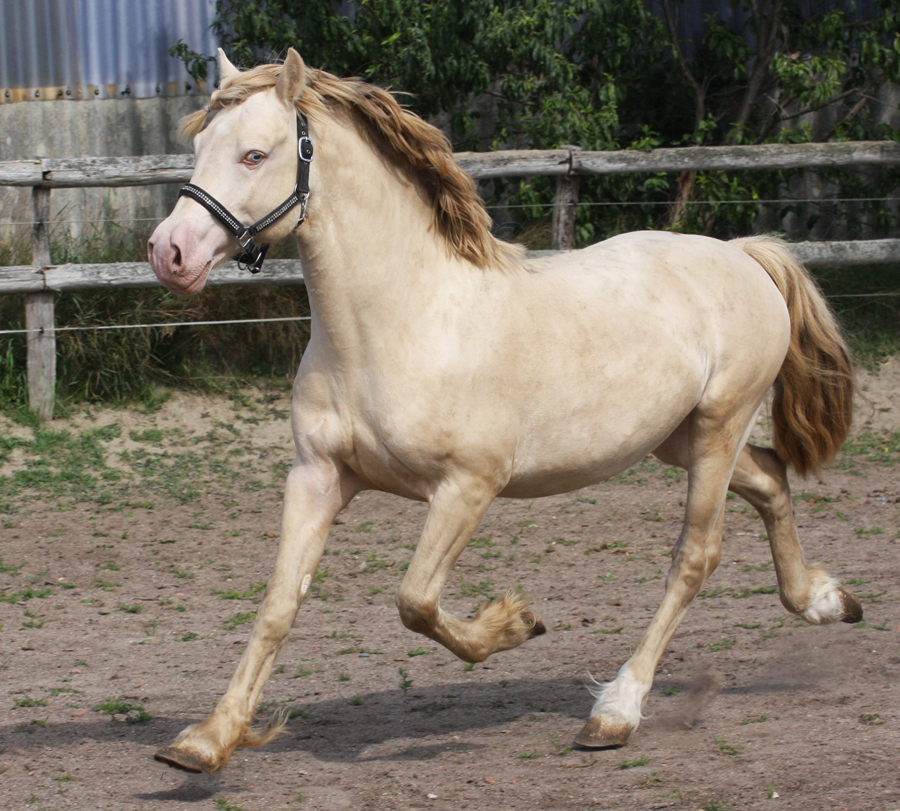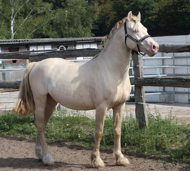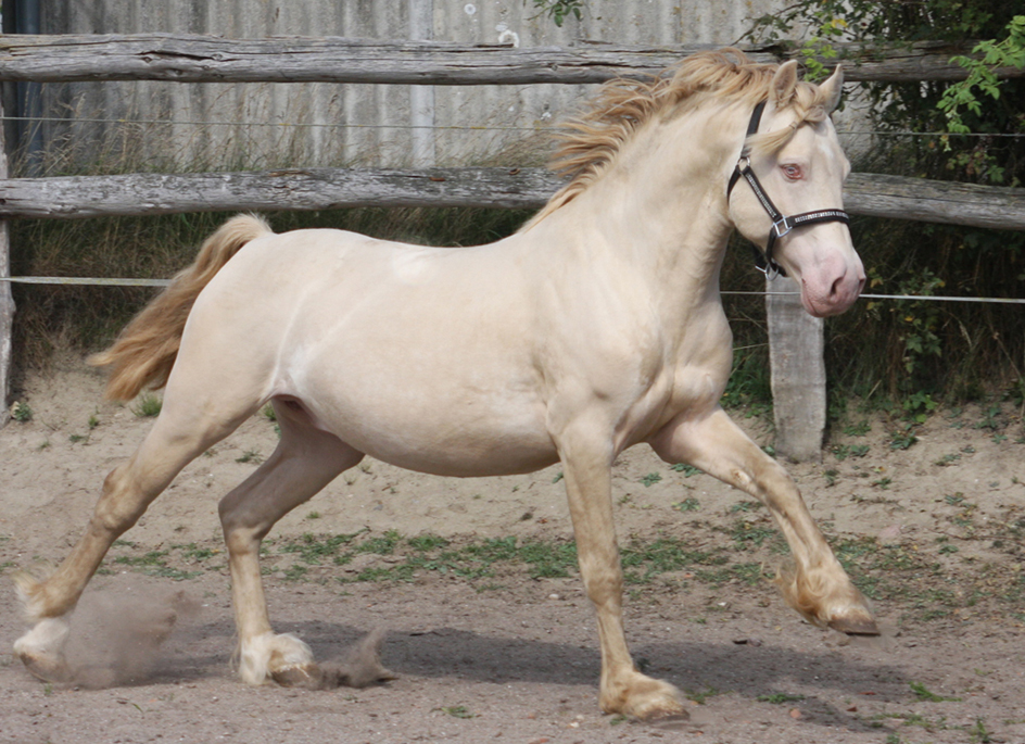 ein toller Hengst aus dem Jahrgang 2016 - ein Perlino . Diplomat wurde von uns als Jährling in Wales entdeckt und gekauft, da er ein Sohn des bekannten Penlangrug Diplomat - einem Thorneyside the Terminator Sohn - vom bekannten Brynithon Gestüt ist. Die Mutter von Diplomat ist Gwarchod Briallen - eine Enkeltochter unserer alten Stammstute Llansantffraed Little Sarah v. Fronarth Llewelyn. Also die Mutter Falbe - der Vater Falbe - wie ich das las konnte das Fohlen nur ein perlino sein. Und es war einer. Ich sah Diplomat als Fohlen und dann als Jährling konnte ich ihn kaufen. Diese Mischung von altem Cardi Blut mit Terminator Blut ist eine gute Mischung. Das fertige Ergebnis hat Fundament , Ponytyp und viel Go gepaart mit einem sehr umgänglichen freundlichen Charakter. Also perfekt für unsere Zucht . Dippy hatte im letzten Jahr die ersten Fohlen für uns - fast alles Falben. Er hat sich gut vererbt - also lagen wir nicht so schlecht als wir uns für diesen Hengst in so jungen Jahren entschieden haben.
