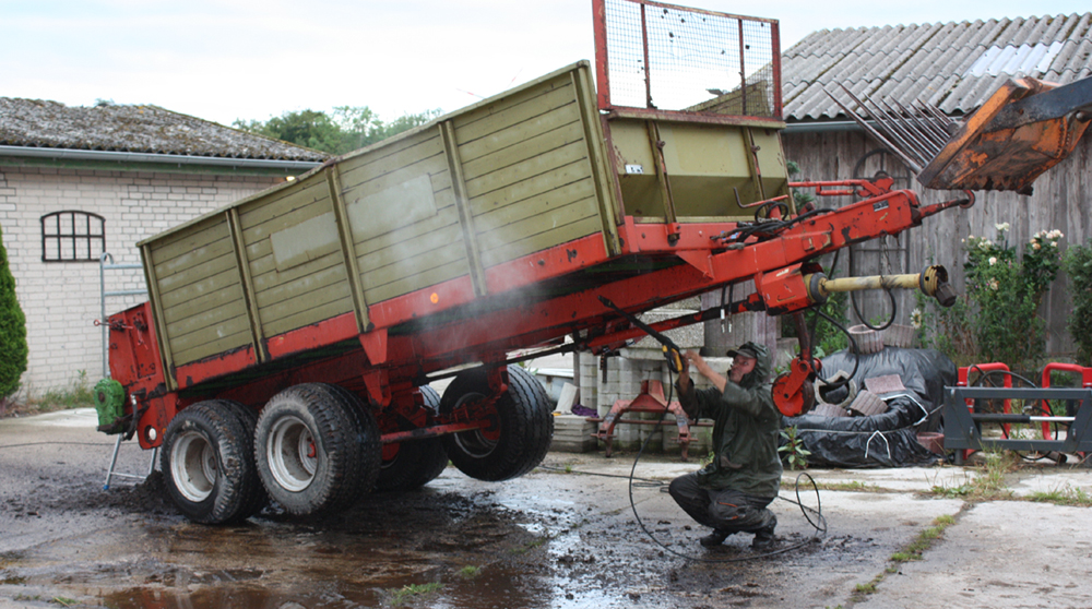 | Hier wird der große Misstreuer gereinigt - das macht eigentlich keinen Spaß - Chef bei der Arbeit |