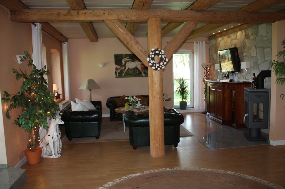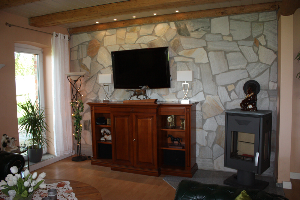 | Das Wohnzimmer im Gestütshaus - Natursteinwand und 3 Seitenkamin zum Wohlfühlen |