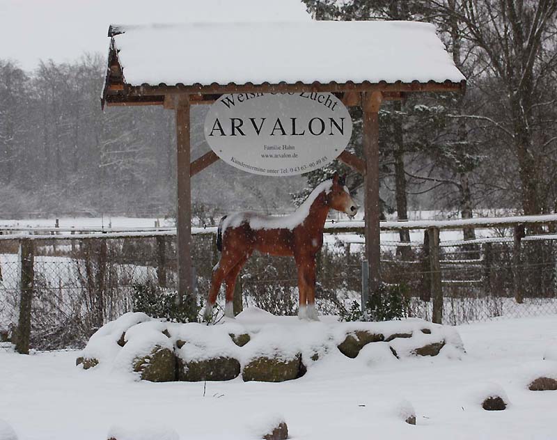 | Am Eingangstor werden Sie von unserem Arvalonfohlen begrüsst - es ist immer freundlich - Sie befinden sich nun auf dem Parkplatz vor dem Gestüt rechts |