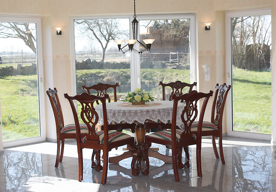 | Der Wintergarten mit Blick auf die Weiden - wir haben nun aktuell ein englisches Esszimmer - ein Mitbringsel aus Wales |