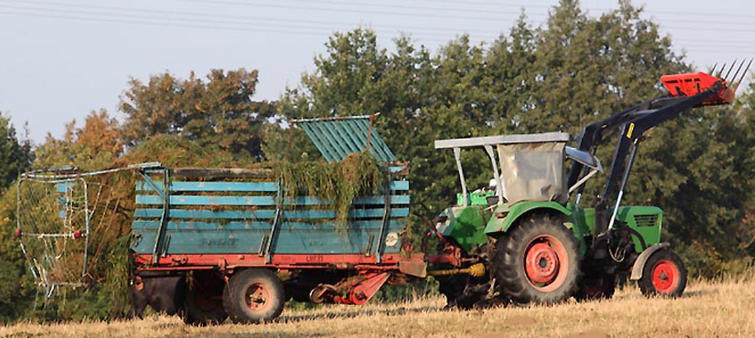 | Wir fahren im Herbst und bei Trockenheit laufend Frischgras auf die Stutenweiden - wir haben dafür einen Ladewagen |