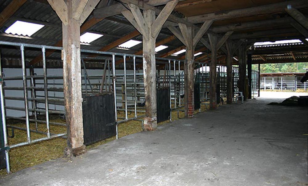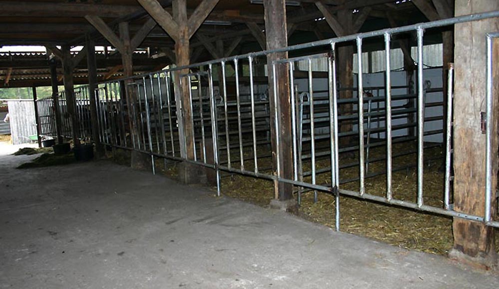 | Einzelboxen im Scheunenanbau mit Durchfressgittern |