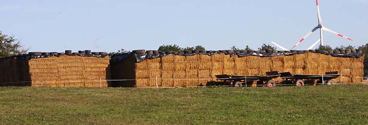 | Stroh Quaderballen lassen wir pressen - wir machen 1000 große Ballen im Jahr zusätzlich zu unseren Rundballen - der Winter kann kommen |