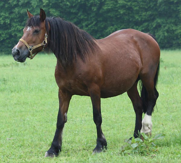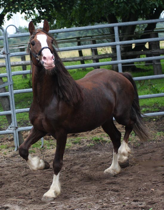 | Brynithon Primrose Vater: Thorneyside the Terminator v. Brynymor Welsh Magic Mutter: Lady Rosebud v. Trevallion Prince Comet Diese Stute habe ich in Wales durch Zufall über die Weide traben sehen und ich war total beeindruckt. Sie flog nur so und schnaubte wie eine walisische Lady. Nach einem Blick in die Abstammung war uns klar, diese Lady ist einfach wie gemacht für unsere Zucht. Sie ist tragend von einem Brynithon Hengst und wir sind sehr auf das Fohlen gespannt. Primrose ist einfach ein Taum von einem echten Cardi Cob und wird bei uns in die Falbzucht gehen.