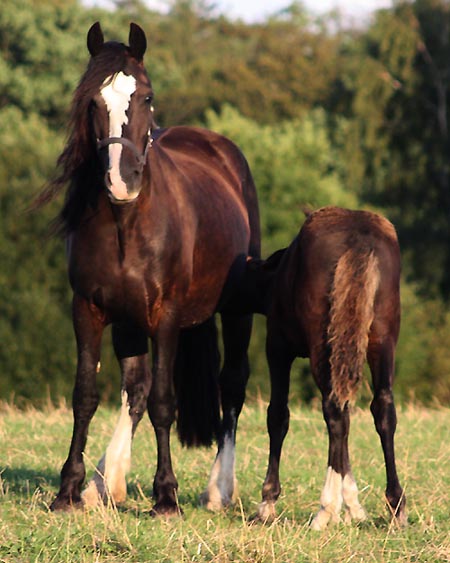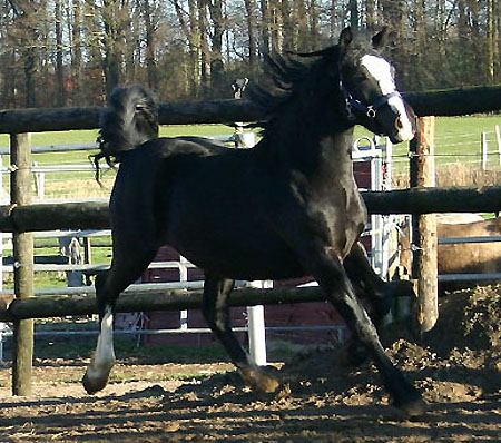 Pepsi ist eine sehr typvolle und bewegungsstarke Tochter des Pentrefelin Talisien und seine Allerletzte, da dieser sehr erfolgreiche Hengst nun aus gesundheitlichen Gründen 2005 im hohen Alter kastriert werden musste. Dieses hat uns Frau Claire Willis-Burton vom Pentrefelin Stud so bestätigt, keine weitere Cobstute wurde mehr in 2005 gedeckt oder tragend. Pepsi ist ebenfalls eine Halbschwester von Tardebigge Estelle, die als teuerste Zuchtstute aller Zeiten für 17.ooo,- Pfund vom Pentrefelin Gestüt auf der Cobsale vor 2 Jahren verkauft worden ist. Dieses Blut - besonders von Nebo Prince macht diese Stute für unsere Rappzucht sehr interressant. Pepsi hat einen kindlichen Charakter und ist sehr anhänglich - sie ist ein sehr verspielter Jährling und tobt wie ein Dragon im Paddock - welch ein Anblick, wir sind sehr glücklich mit diesem Edelstein. Pepsi war auf einigen Schauen in Wales schon sehr erfolgreich. Diese Stute hat einen Charakter aus Gold. Sie hat bei uns ihr erstes Fohlen bekommen und ist eine tolle Mutter. Wir verkaufen diesen Edelstein nur, da wir sehr viele Elitestuten aus Wales importiert haben und nun eigene Nachzucht einsetzen möchten.