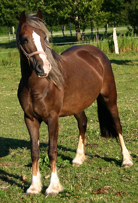 Chiquita ist ebenfalls eine der letzten Töchter von Nebo Celebration 24641. Sie ist sein Abbild. Die gleiche tolle Liver Chesnut Farbe und die gleichen Abzeichen. Die Bewegung hat Sie auch geerbt. Diese Stute hatte sehr gute Fohlen bei uns und ist nun in den Sport verkauft worden, siehe Aktuelles.