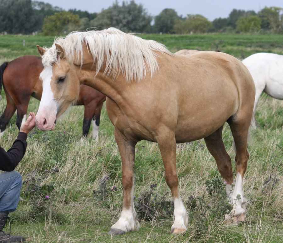Primrose hat enorme Präsenz, kann sich toll bewegen mit viel Schwung und sehr raumgreifend - wird über 1.50 groß und ist sehr anhänglich. Sie schmust gerne - kommt meistens als erste auf der Weide und will alles untersuchen und sofort irgendwie mitmachen. Oft tanzt sie auch um einen herum - Schweif hoch und voller Lebensfreude. Doch sobald das Kraulen losgeht - sitzt sie auf dem Schoß - vor allem bei meinem Mann.