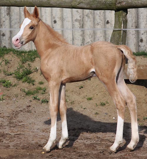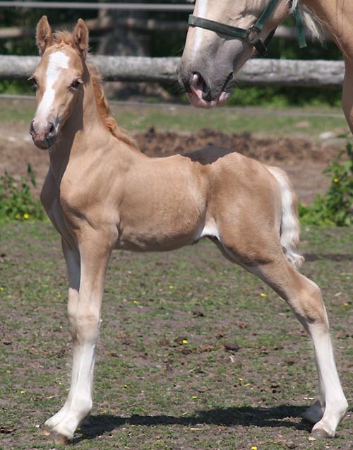 ein sehr schönes Hengstfohlen , Farbe in tollem Gold mit wunderschönem Gesicht. Ein schicker Stern auf der Stirn , steht da wie ein Modell und ist total keck. Was für ein Goldstern. verkauft nach Österreich |