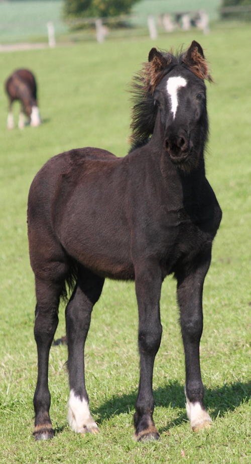 Welsh Cob Hengstfohlen geb. 29.05.2014 Rappe mit Keilstern , 2 weiße Socken Vater: Pantanamlwg Culhwch v. Gwynfaes Culhwch Mutter Rhydfendigaid Tanya v. Penddolfawr Cardi/ Pendam Cardi