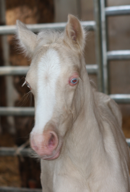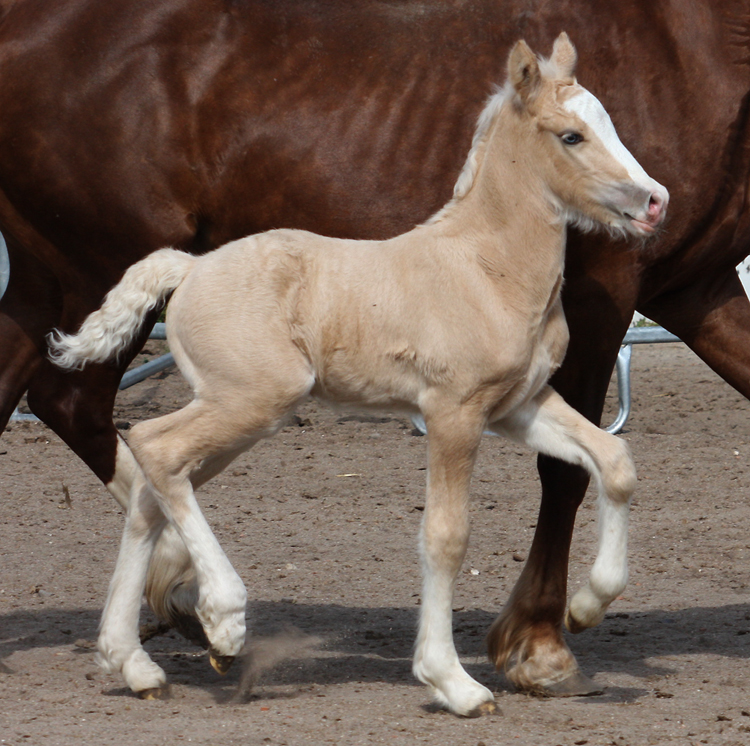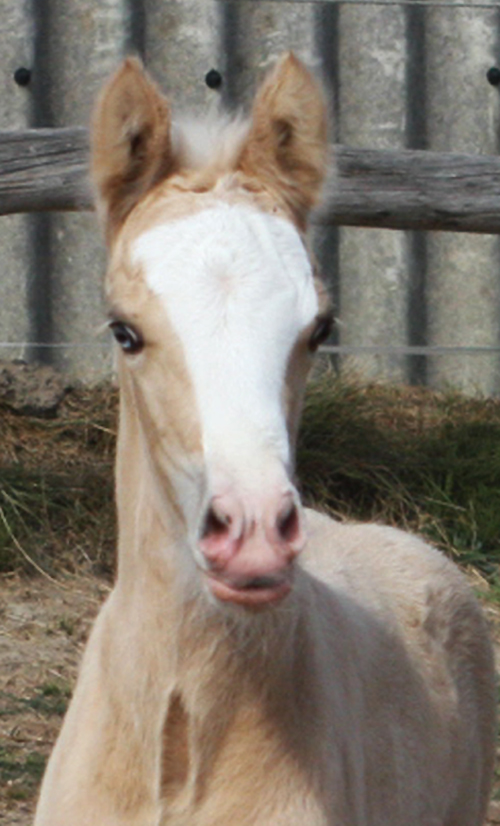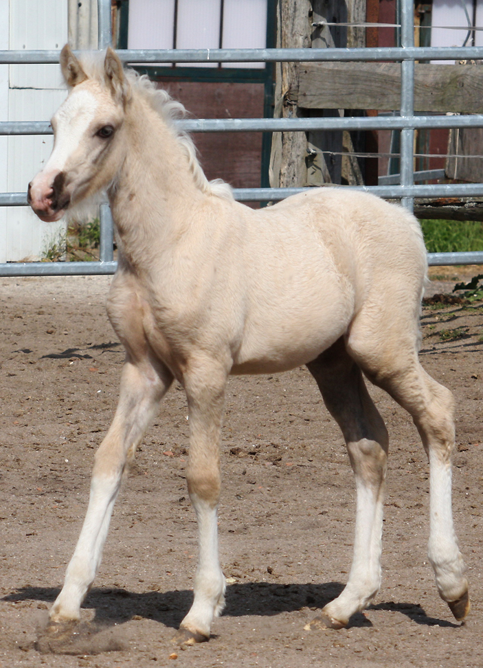 Welsh Cob Stutfohlen Goldpalomin, Blesse, 4 x weisse Socken, bizarre Blesse und blaue Augen Vater: AC Cream Boy v. Thorneyside Cream Boy Mutter: Fronarth Tabby v. Fronarth Messiah