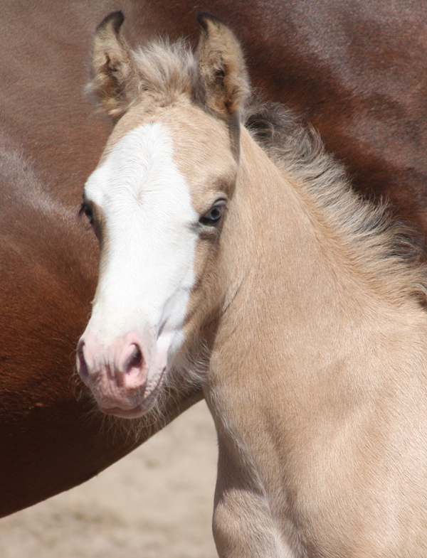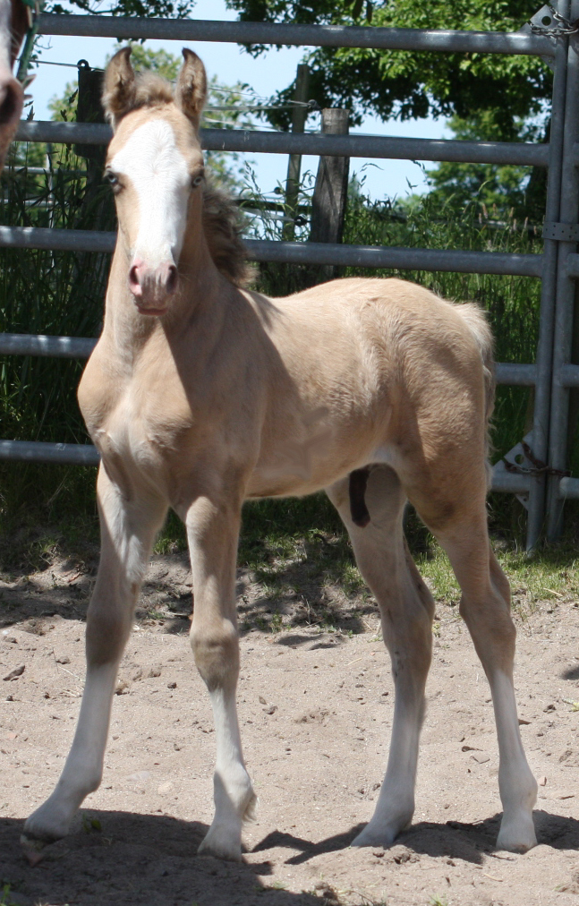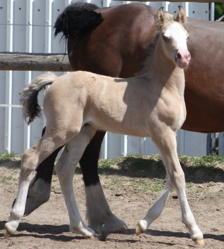Welsh Cob Hengstfohlen Goldfalbe , 4 weiße Stiefel , Blesse , Blaue Augen und Silberhaar Vater: Dwyfor Scooby Do - Llanarth Blut Mutter: Tynybryn Briallen v. Nebo Daniel