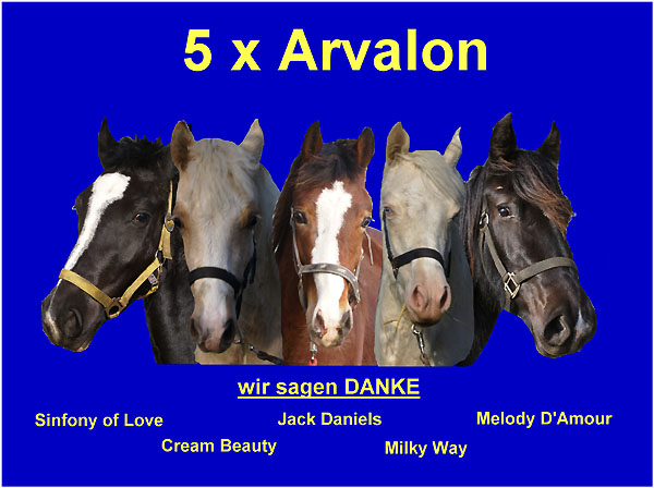 Über 100 Fohlen sind in den letzten 4 Jahren auf Arvalon geboren und die meisten davon haben in vielen Ländern wie Schottland, Belgien, Holland, Dänemark, Österreich, England, der Tschechei und natürlich in allen Bundesländern Deutschlands neue Besitzer gefunden. Einige sind mittlerweile gekörte Hengste, einige Stuten gehen nun schon in die Zucht, aber alle haben eines gemeinsam - den guten Charakter von dem alle Kunden schwärmen. Sie lassen uns am Aufwachsen der Fohlen durch Fotos und E-Mails teilhaben - dafür bedanken wir uns sehr. Wir sind sehr zufrieden!!!!!!!!!