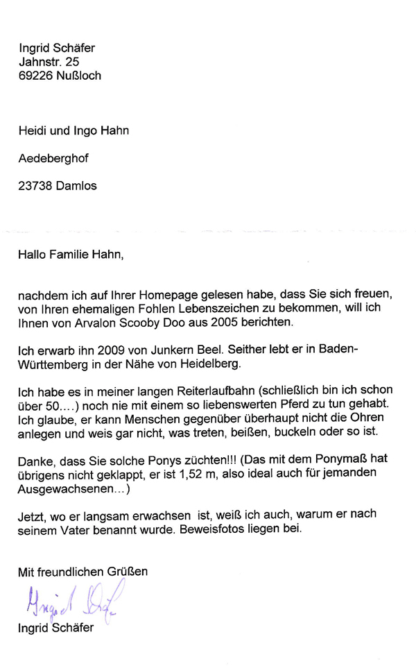 weiterhin möchten wir uns nochmals bei allen unseren Kunden bedanken, speziell für die viele Post zu Weihnachten. Wir haben wieder etliche Briefe mit Fotos bekommen, in denen uns Menschen über ihre tollen Ponys berichten, welche von uns gezüchtet wurden. Hier kurz ein Brief von dieser Woche - es zeigt wieder mal das unsere Ponys doch überall für Freude und Begeisterung sorgen. Dafür sagen wir "Danke" - wir sind immer noch auf dem richtigen Weg.