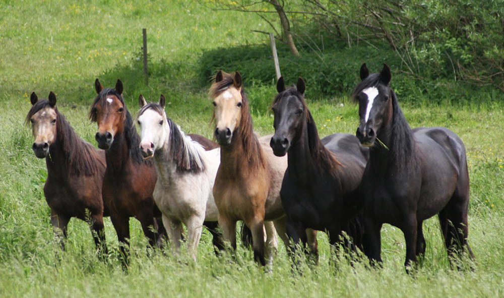 Bunte Jungstutenherde - 2 und 3 Jahre alt auf der Weide