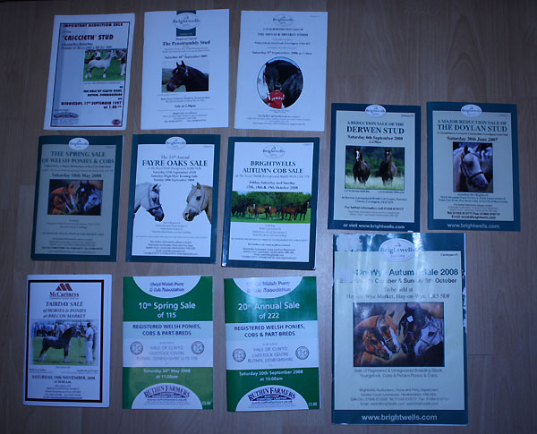 Mehrere hundert Auktionskataloge von 30 Jahren Welshauktionen wie z. B. den bekannten Fayre Oaks Sale, Royal Welsh Cob Sale, Hay on Wye Breedersale, Gestütssales, Regionalen Sales,