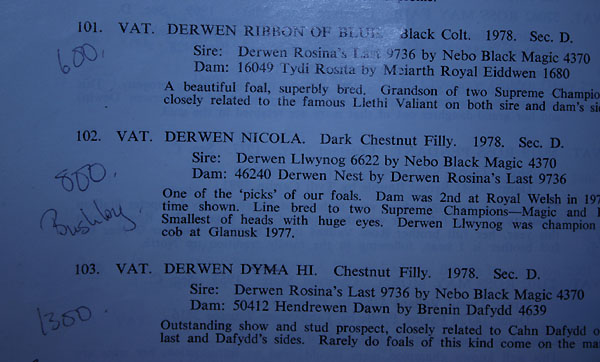 festgehalten mit Kommentaren , Preisen der Pferde und wer sie gekauft hat. Diese Sammlung ist einzigartig in der Welsh Zucht und sehr informativ.