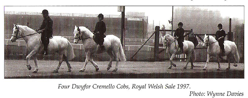 Das Dwyfor Gestüt hat mit Hilfe von Cremello Stuten eine große Palominozucht mit Llanarth Blut aufgebaut in den 70er und 80er Jahren. Bei der Teil Auflösung dieses Gestütes in 1997 wurden die meisten Zuchttiere auf der Welsh Cob Sale verkauft - dafür gab es den Champagne Moment Pokal von der Auktionsleitung für den besonderen Moment - das gab es noch nie in der Zucht. Diese Stuten begründeten nun neue Farbzuchten und gaben der Welsh Cob Zucht auf breiter Front mehr Farbe in den letzten 10 Jahren.