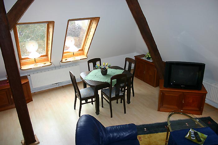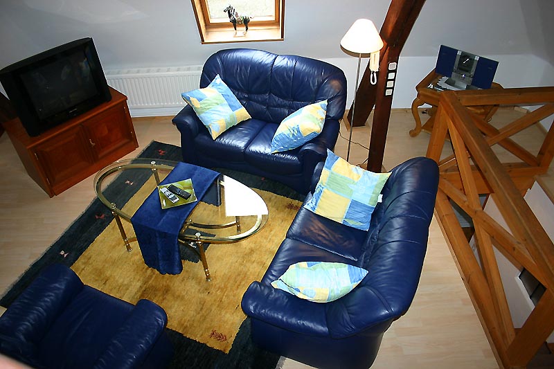 Die Wohnung ist ausgestattet mit Satelliten TV, DVD Player, Stereoanlage mit CD, in der Küche mit Spülmaschine, Microwelle, Cerankochfeld, mit exclusiven Gemälden, Porzellan und in allen Räumen edlen Kirschholzmöbeln- sowie Vollholzmöbeln im Bauernstil. Helles Parkett und echte Teppiche machen ein sehr wohnliches Ambiente . Teilweise wurde originales Eichefachwerk mit eingearbeitet auf 2 Etagen.